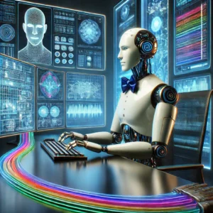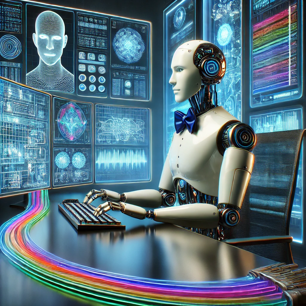 DALL·E 2025-03-12 15.51.25 – A square image. A sleek, humanoid robot sits at a high-tech desk with a futuristic computer setup in a calm, cyber-inspired environment. The robot has